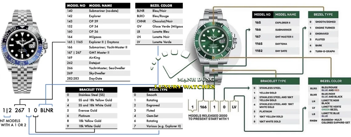 - Mẫu mã (model): Xác định dòng đồng hồ cụ thể, ví dụ như Submariner, Datejust, Daytona, GMT-Master II,…